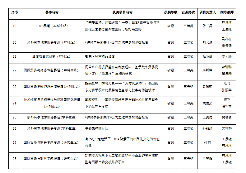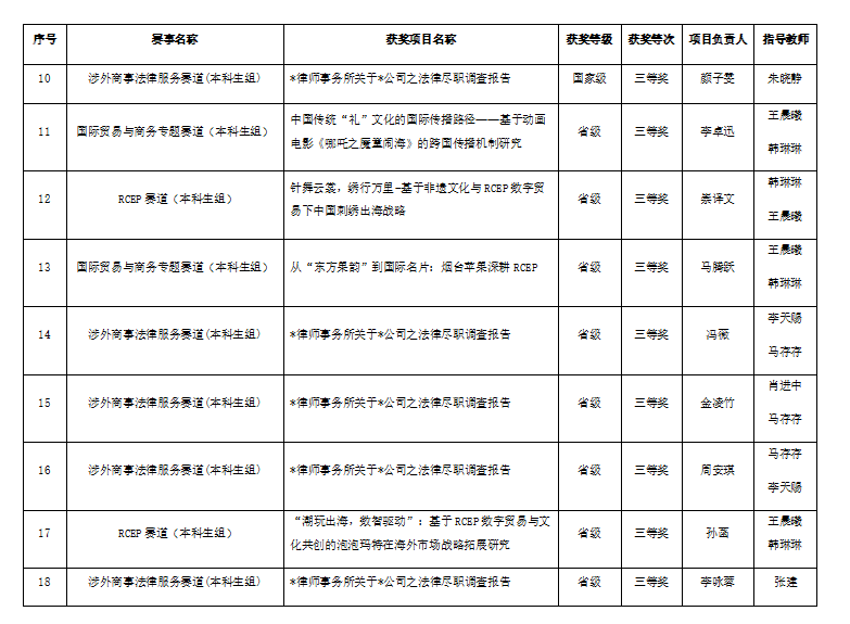 为提升法商融合型人才培养质量,促进理论教学与实务操作深度融合,法学院自7月至11月经过精心准备,百余名学生参加了商事精英挑战赛相关赛道的比赛,29个团队的参赛作品获得省级以上奖项,其中国家级一等奖3项,二等奖3项,三等奖7项,省级三等奖19项。尤其是为配合涉外法创新人才培养实验班建设,助推学生涉外商事法律服务能力成长,本年度通过“揭榜挂帅”承办涉外商事法律服务赛道的校赛,经过知识赛、法律尽职调查作品的遴选,18支参赛队伍成功进入山东省赛,获得省赛一等奖、二等奖、三等奖各3项、6项、9项,并在全国总决赛中获一等奖、二等奖、三等奖各3项的优异成绩。此外,在国际贸易与商务专赛道中,获国赛三等奖3项、省赛三等奖5项;在RCEP赛道中获省赛三等奖4项;在酒店项目策划赛道、国际贸易竞赛跨境电商赛道及技术性贸易措施评议与标准国际化赛道获省赛三等奖各1项。